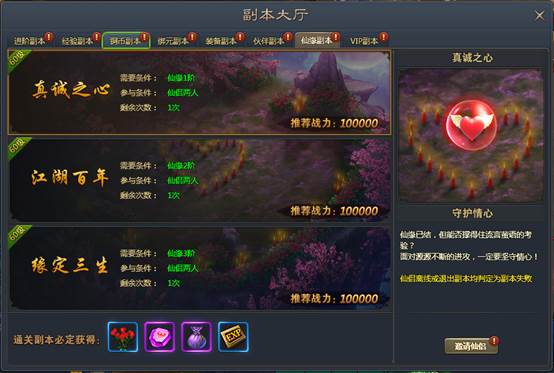 3、 仙缘副本每个副本每日通关后可花费一定元宝重置3次,每次重置必定获得奖励。