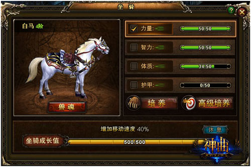 2、培养能增加坐骑的属性,提高坐骑阶级能提升能培养的属性等级上限。