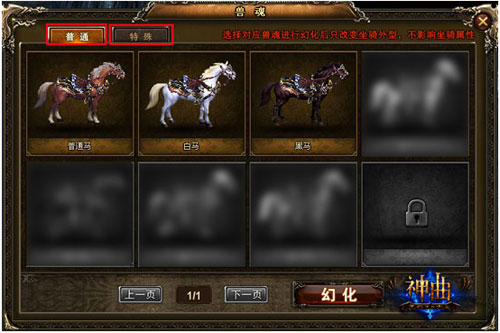 普通兽魂:普通兽魂会根据坐骑等级逐个开放,玩家可点击当前坐骑以外的坐骑进行幻化,幻化后,坐骑外形变为幻化后的外形,但坐骑属性不变。