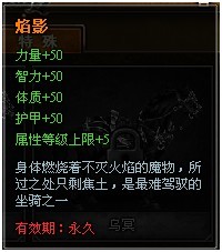 焰影属性:力量,智力,体质,护甲各增加50,属性等级上限增加5。