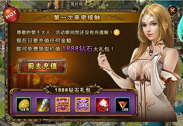 活动描述:新服火热开启了,充值任意金额就可获得价值1888钻石的大礼包,还有属性诱人的橙色戒指等着您哦!