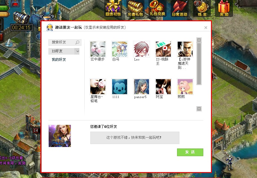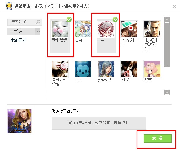 3、选择您所要邀请的好友,点击【发送】按钮,即可邀请您的IS好友来玩IS《神曲》