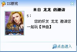 4、只要您的邀请好友IS在线,即可以IS消息盒子形式收到您的邀请,当您的好友点击后即可直接进入IS《神曲》的精彩世界,与您一起畅玩游戏。