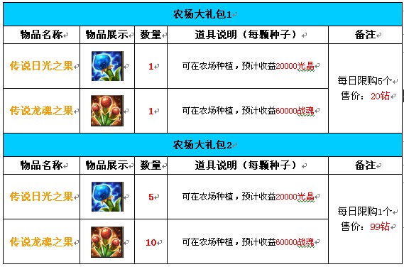 活动内容:辛勤耕种,一番收获,为答谢广大玩家,上线农场大礼包,体验耕作劳苦,收获丰硕果实!