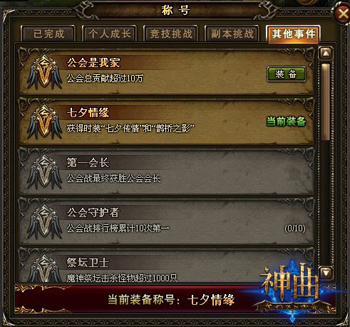 神曲中可以获得的所有称号,都会在称号列表中全部显示。称号列表以获得分类标签的方式显示,列表目前分五个标签。尚未获得的称号,显示灰色。已获得的称号会激活,可以随时装备在头顶,但每次只能装备一个称号。