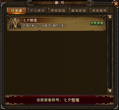 2、玩家收集“七夕传情”和“鹊桥之影”即可获得七夕绝版称号!(在人物属性“称号”界面查询当前获得的称号)