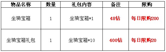 2.坐骑宝箱开出的道具与兑换所得物品均绑定;