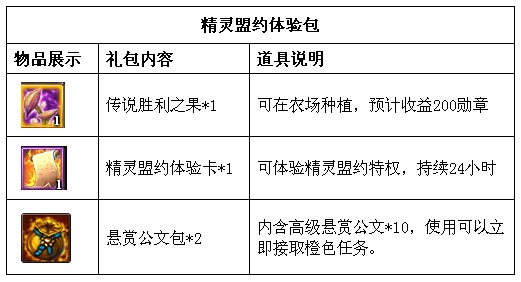 活动内容: 活动期间,玩家充值任意金额即可获得精灵盟约体验包。