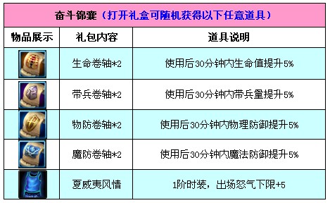 活动奖励:单身贵族的最爱,隐藏着不为人知道的秘密。打开可随机获得:生命卷轴*2,带兵卷轴*2,物防卷轴*2,魔防卷轴*2中的一种,同时一定几率获得夏威夷风情。