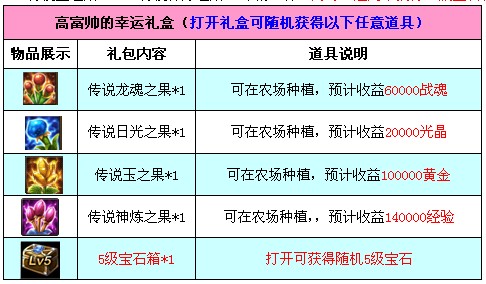 活动奖励:高富帅的身份象征,惊喜等着你。打开随机获得:传说龙魂之果*1 ,传说日光之果*1 ,传说玉之果*1 ,传说神炼之果*1中的一种,同时一定几率获得5级宝石箱。