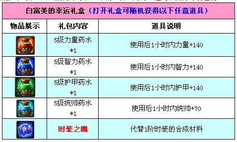 活动奖励:女神私藏的礼盒,从不外露。打开可随机获得:5级力量药水*1,5级智力药水*1,5级护甲药水*1,5级统帅药水*1中的一种,同时一定几率获得时装之魄。