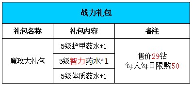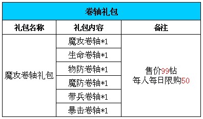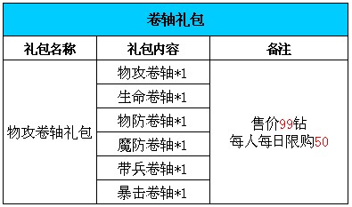 活动描述:众神之战期间,商城出售超值战力大礼包,卷轴礼包