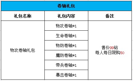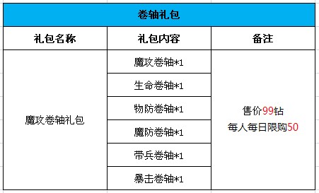 活动描述:众神之战期间,商城出售超值战力大礼包,卷轴礼包