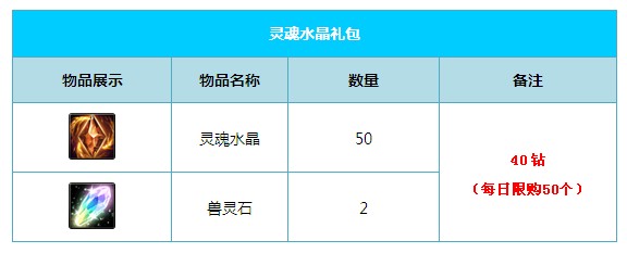 活动内容:活动期间内,商城上架灵魂水晶特惠礼包