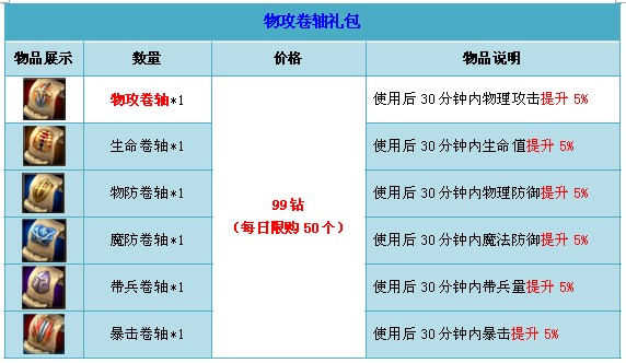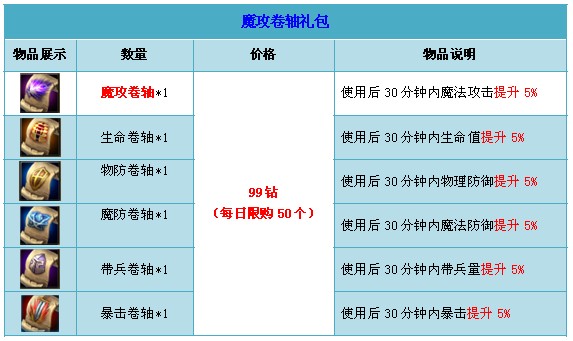 活动内容:众神之战期间,商城出售超值战力大礼包,卷轴礼包