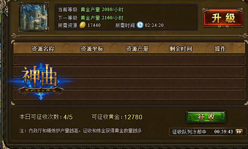 这里要提到的是,内政厅每天5次的征收是有冷却时间的,玩家需要定时的收取。如果想要获得更多的黄金,每天去更新矿源也是必须要做的事情。考虑到建筑物升级也有冷却的时间,玩家大可以在休闲挂机的同时,获得大量的财富,何乐而不为呢!