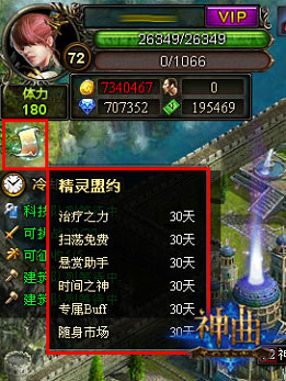 精灵盟约是一种期限类道具,拥有6种神秘的BUFF效果,玩家可直接开通所有效果,也可在商城任意购买其中1种,开通后在有效期限内玩家可享受精灵盟约带来的BUFF效果,BUFF效果的有效期时间可累加。所有勇士都可以免费享受24小时的精灵盟约效果,作为IS《神曲》给玩家的免费体验时间。