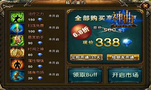 随身市场:开通后,在有效期间内可以在任意场景打开市场界面。当开通“随身市场”时,打开精灵盟约界面,点击“开启市场”按钮,就可以随时进入市场界面。