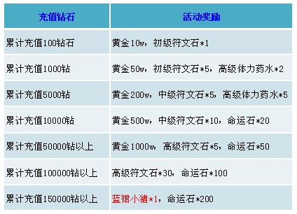 活动内容:倾情大回馈,活动期间,累计充值钻石数达到指定数值时,可获得相应奖励(奖励可累计领取),更有机会获得萌萌的蓝裙小猪和稀有的命运石。