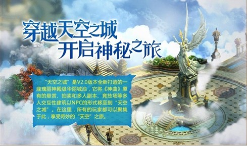 英雄的等级达到了11级的玩家,在登陆新的V2.0版游戏时进入的画面将不再是内城画面,而是出现在天空之城,众多玩家聚集于此,点击玩家就可以进行即时的交流和互动。天空之城的出现取代了原有的外城,新版本中玩家无需找矿、打劫,内城的黄金收益得到了极大地提高,新的神曲更加和谐。