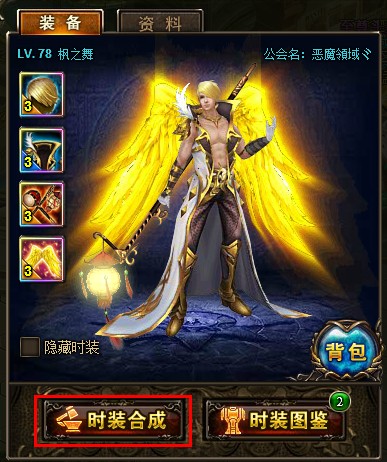 选择时装合成即可进行时装合成。时装合成材料为两件同类部位的时装,时装之魄可以代替一件一阶时装,但翅膀与时装之魄合成时,则需要5个时装之魄。当合成3阶以上时装时,只有用同阶的时装合成才能获得高的成功概率,仅用低阶时装或时装之魄则很容易失败。