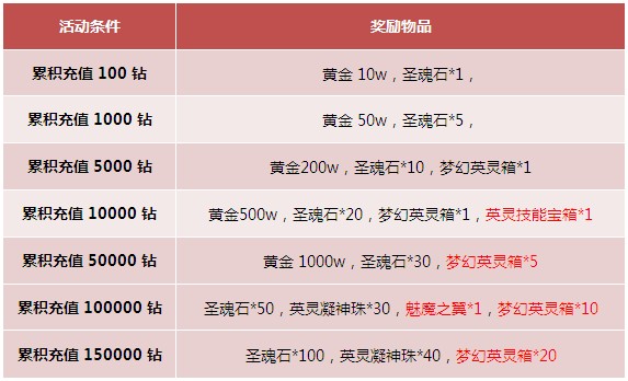 1. 玩家累计充值150000钻石,可领取全部奖励;