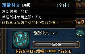 驱散对方有益效果。当流血或恢复符文其中之一等级过低时可以考虑佩带的符文,起作用是驱散对手的护盾。在战士内战时由于物防很高打掉对手的护盾比较吃力,而用符文驱散非常方便快捷,尤其在对抗双盾反伤流的另类战士时高级的驱散效果显著。但由于其局限性且实战效果不如性价比很高很容易升级的流血和恢复符文,因此仅建议在流血和恢复符文等级低时考虑使用。