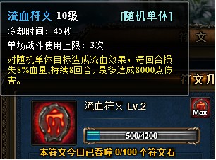 对随机单体目标造成流血效果,每回合按生命上限百分比损失血量,但每回合掉血量根据符文等级有不同上限(如1级为1500)。随着符文等级提升,流血量及使用次数也随之提升。