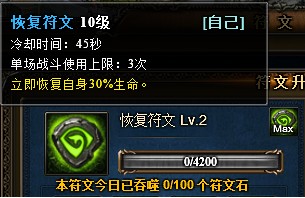 立即按百分比恢复自身生命,随着符文等级提高恢复生命值和使用次数也随之提高。