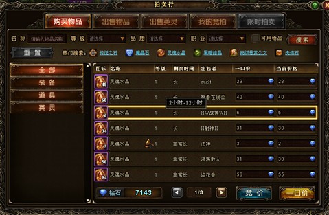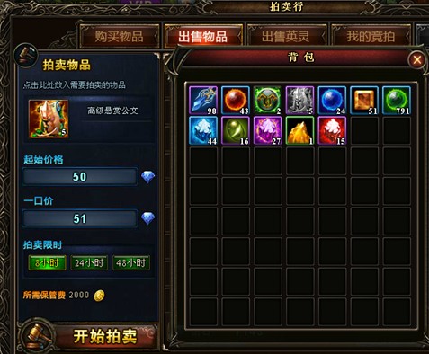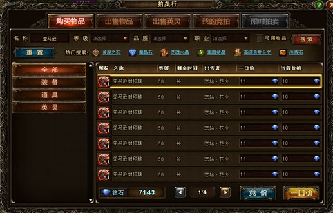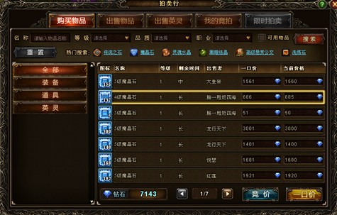 玩家可以将未绑定的物品,放置市场中进行拍卖。拍卖有两种方式:竞价和一口价。买家投了竞价后,卖家就不能取消拍卖。超出拍卖时间,物品就归于竞价最高的买家。