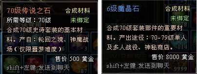 魔晶石是合成橙色套装的重要材料。70级套装的帽子、项链、武器和盔甲4件装备,打造每件装备各需400个6级魔晶石,总共是1600个6级魔晶石。玩家可以在70-79级的单人或多人副本中获得,在神秘商店中也有机率刷出可供玩家购买。