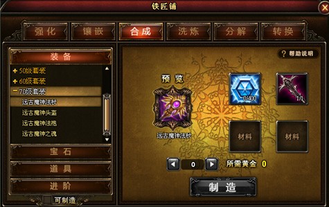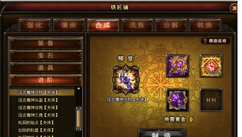 IS神曲中,史诗套装是需要进阶而成的,顾名思义,进阶是需要有原材料的。要打造非一般的70级史诗套装,首先,我们需要做的是打造70级紫色套装,在铁匠铺中,玩家使用6级魔晶石+远古材料就可合成。
