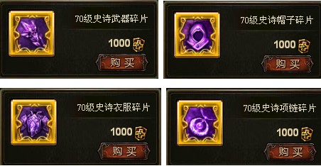 史诗碎片是合成橙色装备的必须材料。武器、帽子、项链和衣服的碎片,玩家可以使用勋章在竞技场商店中兑换,每件装备需要使用25个碎片,4件装备总共需要10万个勋章。