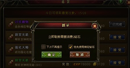 每刷新一次悬赏需要消耗2Z,每刷新一次神秘商店则需要10Z。悬赏可以提升每日的经验值,而不同颜色的悬赏任务可获得的经验值是不一样的。