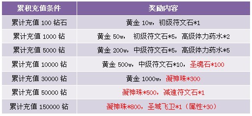 2. 累积充值达到1000钻石可同时获得累积充值100和1000档次的两重奖励,依此类推;