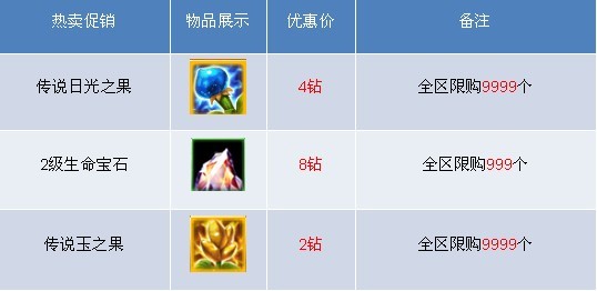 活动奖励:活动时间,商城限时热卖区,2级生命宝石,传说日光之果、传说玉之果打折促销,抢购数量有限,卖完即止。