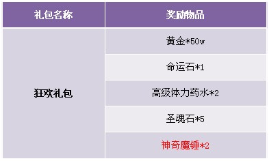 活动内容:活动期间玩家充值任意金额,即可获得超值狂欢礼包一份,狂欢礼包更有稀有神奇魔锤2个!