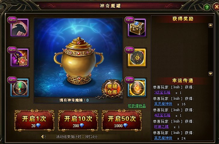 【活动内容】魔罐神秘降临,各种丰富道具,英灵凝神珠,5级宝石箱,高级符文石,命运石,70级传说之石包等着你拿哦~更更更有阿波罗封印珠和哈迪斯封印珠等你来领取!