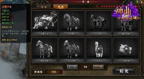 再介绍一下荣誉马:在众神之战中各职业第一名的玩家可获得:魔兽食日;而在每周的公会战中赢得胜利的公会,会长不但享有“第一公会会长”的美称,而且还获得圣兽止砂。这两种坐骑的有效期均为7天。全属性+100。
