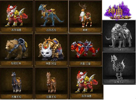 而下面这部分的坐骑都是活动中获得的,如:商城促销,节日活动,魔罐。其中灵兽炎皇是由神曲推出的战神活动获得,全属性+10;吉祥瑞兽、裂岩巨熊、恶魔羊驼:全属性+10;远古迅龙和神兽阿宝、丹波及圣域飞卫:全属性+30;麋鹿和狂暴羊驼:全属性+20;魔界战犀:全属性+40。