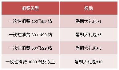 【活动内容】一次性消费达到一定额度即可领取暑期大礼包奖励,多消费多得哦!暑期大礼包更有几率打开获得英灵凝神珠*100!