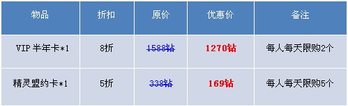 【活动内容】喜迎2.2版本,VIP半年卡8折优惠出售,精灵盟约卡超大优惠,5折出售。开通半年尊贵VIP领取10项特权助您快速升级。