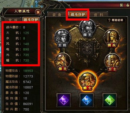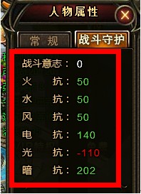 玩家在人物属性界面,战斗守护栏中可以看到当前配带的这只英灵的6种抗性值,称之为战斗意志。抗性分别是:火抗、水抗、风抗、电抗、光抗、暗抗6种。不同的英灵,6大抗性值也会有区别的。