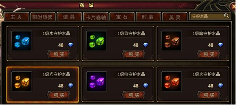开启了守护系统以后,玩家可以通过商城和寻宝任务获得守护水晶石,可以镶嵌到守护系统中。每个插槽可以放入3种守护石,但不能放同类的水晶石。玩家拥有3个1级守护水晶石后,可以在铁匠铺中合成2级的,以此类推。目前守护水晶石最高是5级,5级守护石+54点抗性,4级守护石+42点,3级守护石+30点,2级守护石+18点,1级守护石+10点。