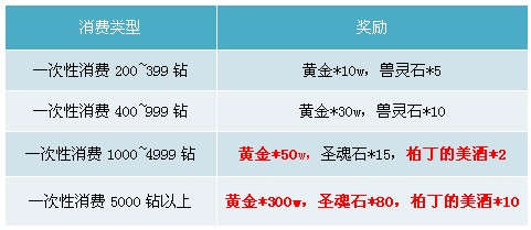 【活动内容】一次性消费达到一定额度即可领取豪华奖励一份,多消费多得哦!多多的柏丁的美酒为您预备下,来准备一醉方休吧!