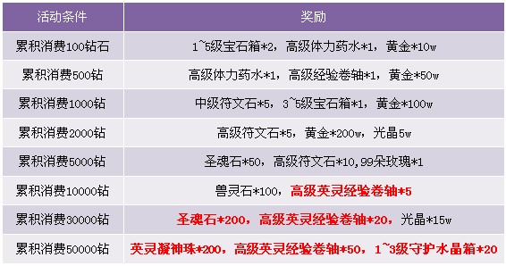 【活动内容】活动期间累积消费达到一定金额即可领取超级大礼包,百万黄金、高级经验卷轴、光晶、圣魂石、英灵凝神珠应有尽有,还有稀有的高级英灵经验卷轴,使用后出战英灵可以立刻获得50w经验,赶快升级你的英灵,体验炫酷战斗吧~