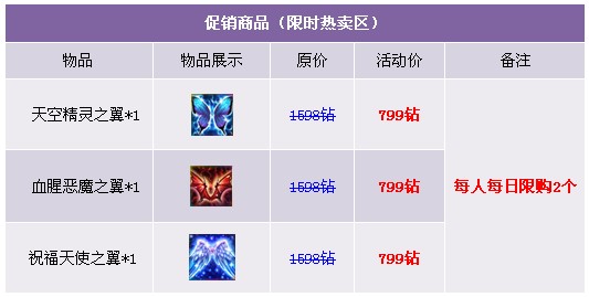 【活动描述】曾经对帅气的稀有翅膀望而却步的你,可曾期盼过有朝一日也能拥有~活动期间内商城翅膀低至5折!如果再次错过我们精心为您准备的翅膀礼包,一定会给您留下遗憾哦!快来选购吧!