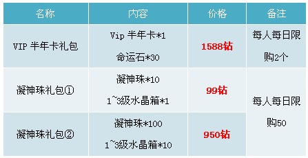 【活动内容】还在为你的英灵功力不足无法击败对手苦恼吗?提升英灵等级,培养英灵资质,增加自身抗性才是王道,活动期间,商城特惠出售VIP半年卡礼包、英灵凝神珠和水晶箱。