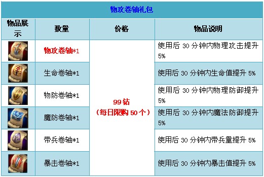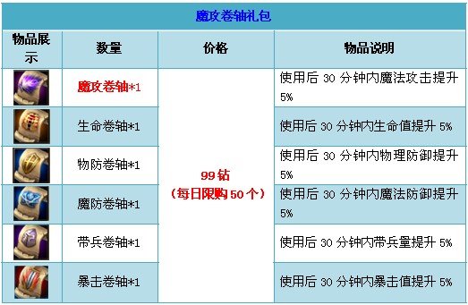 【活动内容】众神之战期间,商城出售超值战力大礼包,卷轴礼包。