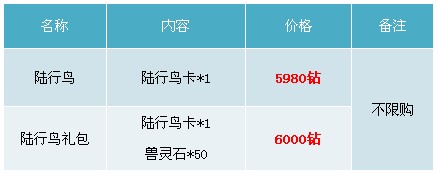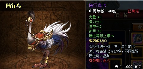 活动内容:活动期间,商城出售超值“陆行鸟”坐骑,属性加40哦!